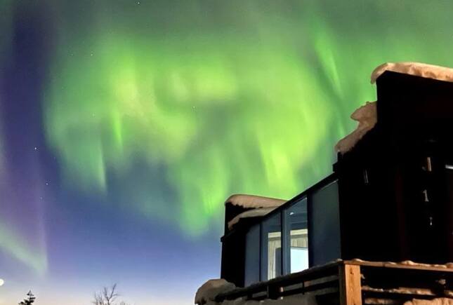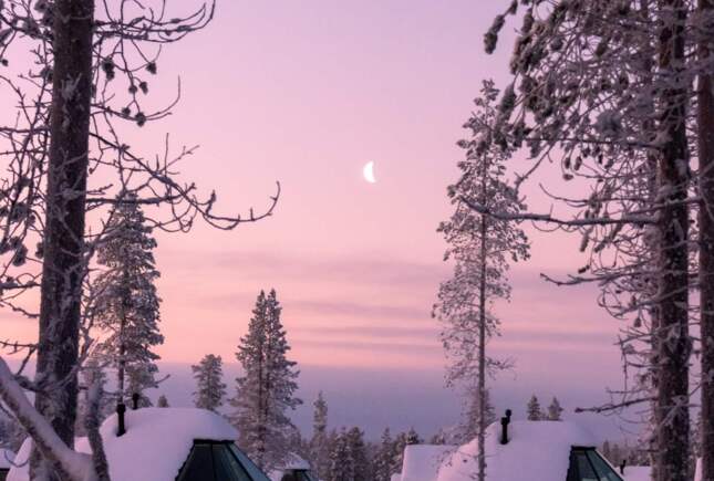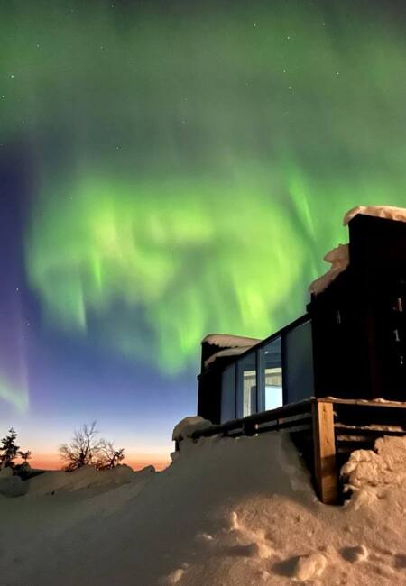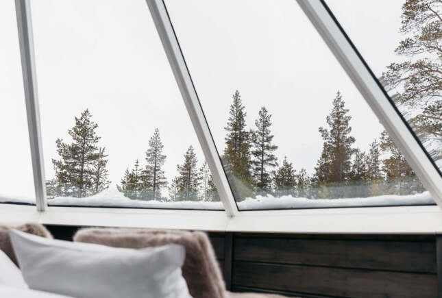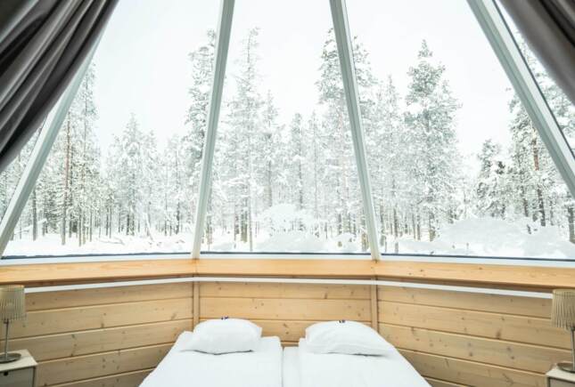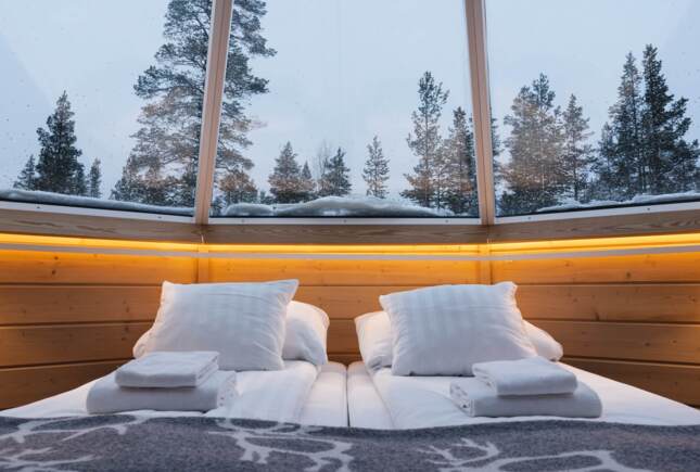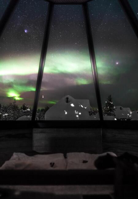 At midnight, a white arctic fox dashes up the fells, trailing its tail through the snow shooting flickers into the sky. The aurora borealis burst into flame over Lapland. Only the glass roof separates you and your warm bed from the cold, flaming sky.