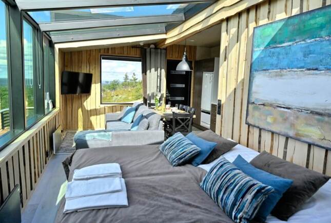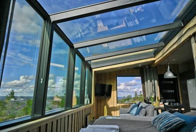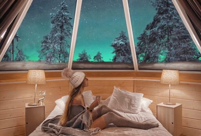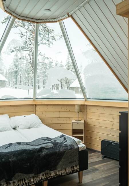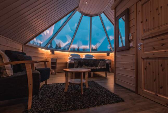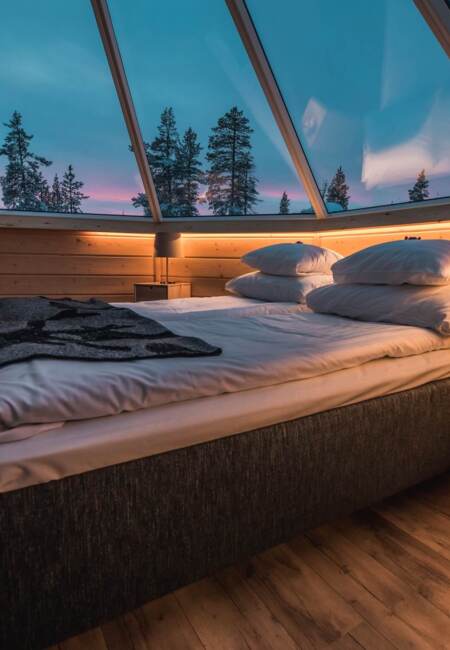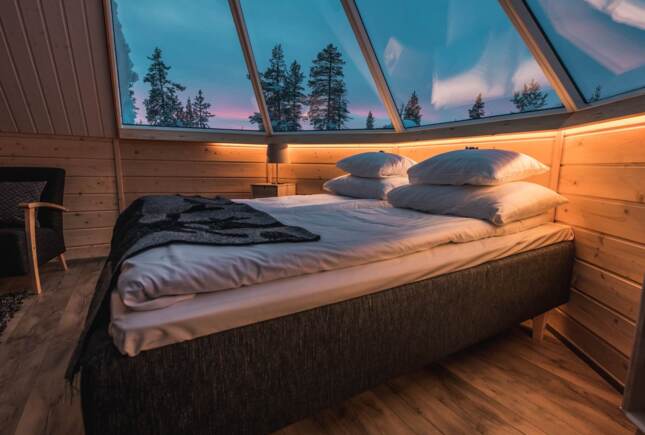 The Aurora Cabins & Polar Sky Suites at Northern Lights Village are a magical way to experience the wintry star-filled sky and the Northern Lights, while lying comfortably in the warm bed. The laser-heated glass-roof opens up into the northern sky, directly above the bed.