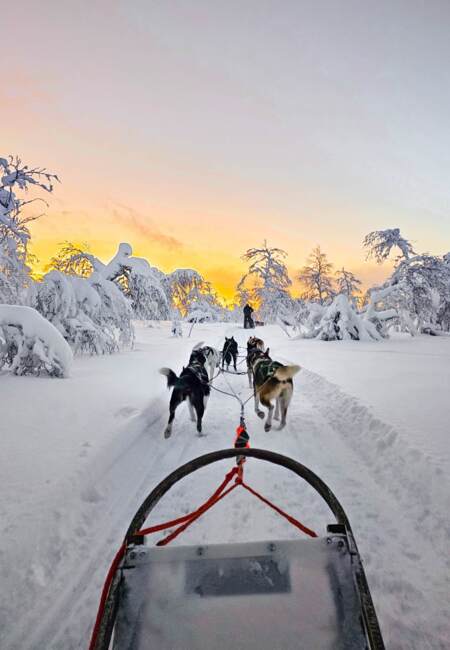 - Driving a team of huskies over the white, shimmering fells is an experience that is almost mandatory during a trip to Lapland. The eager dogs run at full speed and the sleigh glides effortlessly over the snowdrifts with the skids hissing softly.